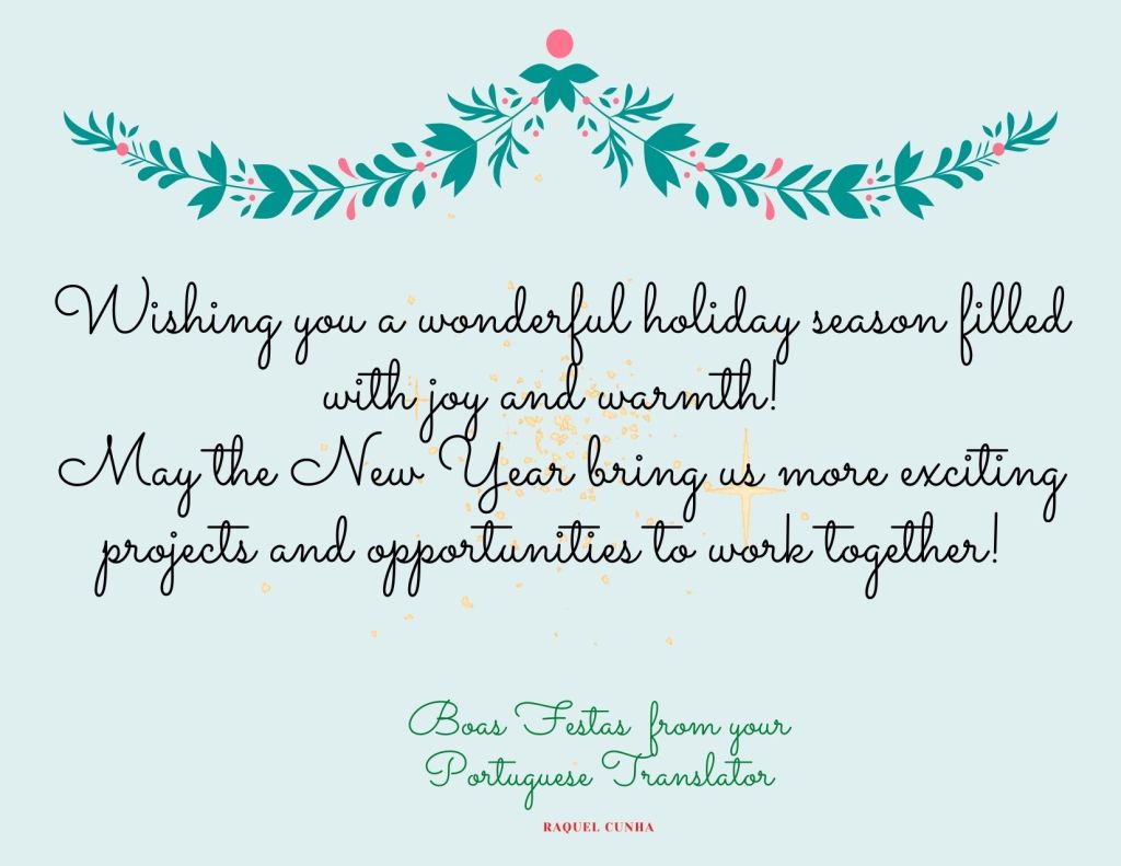 Holiday Greetings! Boas Festas! ❄️🌟🎄 Posted on 17 Dec 202217 Dec 2022 by Raquel Cunha Share this: Click to share on X (Opens in new window) X Click to share on Facebook (Opens in new window) Facebook Like Loading... Related
